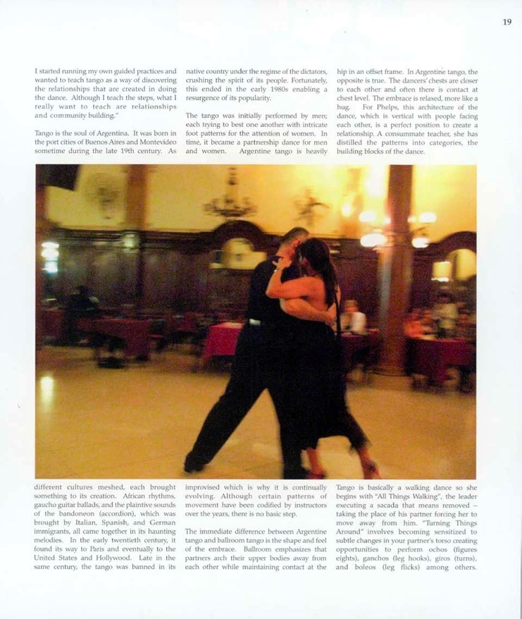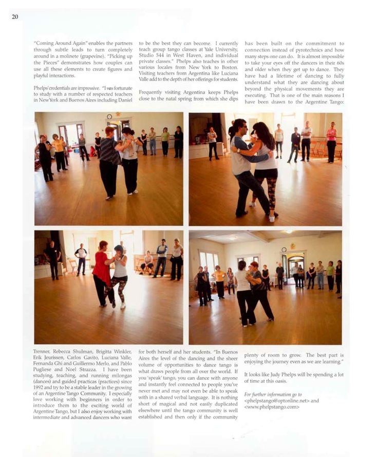 The text is from her interview with me, and the photos include shots of my core teachers (Luciana Valle, Fernanda Ghi and Guillermo Merlo, and Pablo Pugliese and Noel Strazza). Other shots are from Luciana’s workshops in New Haven in the spring of 2011, a New Year’s Milonga where we all put tiny lights on our shoes so they would reflect off the floor, some of my friends dancing at Confiteria Ideal when we went to Buenos Aires to study with Luciana and her wonderful assistants, and a quintessential photo of tango dancers and tourists in La Boca in Buenos Aires.